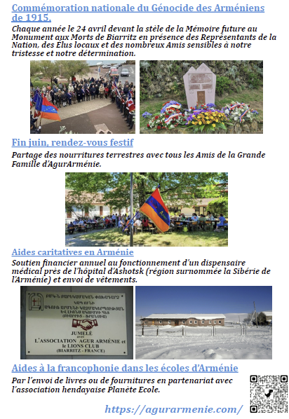 C’est grâce à vos cotisations et à vos dons que l’Association AgurArménie peut déployer ses manifestations culturelles au Pays Basque et dans les Landes et poursuivre ses actions humanitaires en Arménie.