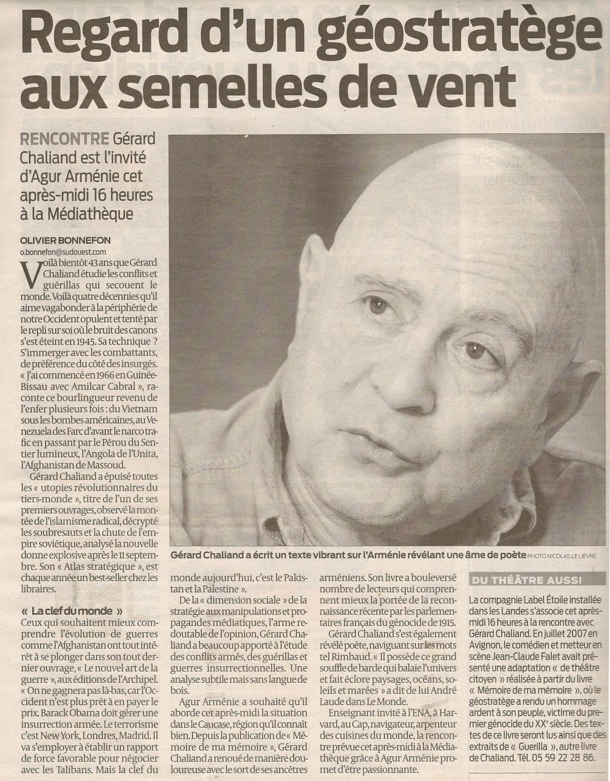 Conférence – Débat La conférence de Gérard Chaliand a rassemblé un large auditoire de plus de 80 personnes à la Médiathèque de Biarritz Le journal « Sud-Ouest » en a fait une pleine page Merci à tous
