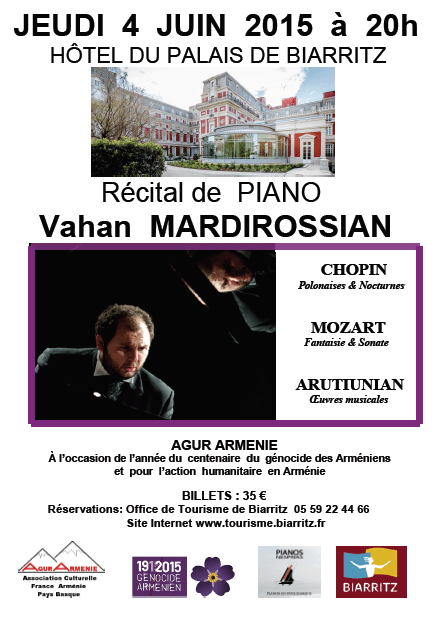 Les billets sont en vente à l’office de tourisme de Biarritz (sur place ou par internet) au prix de 35 €; Mais notre association vous donne la possibilité de les avoir au prix de 33 € par personne ; il suffit de libeller le chèque au nom d’AgurArménie et de l’envoyer à : AGUR ARMENIE Maison des associations 2-4 rue Darrichon 64200 BIARRITZ