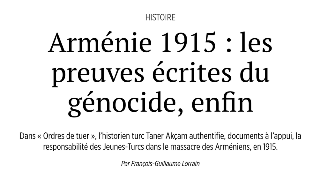 Voici un article intéressant, de l’hebdomadaire Le Point du 2 janvier, sur un livre « Ordres de tuer« , livre qui vient de paraître le 9 janvier, écrit par Taner Akçam, chercheur turc, enseignant depuis 2000 à l’université Clark, dans le Massachusetts.
