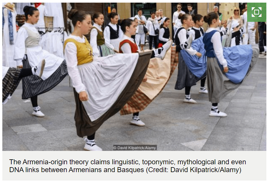 Etait-ce juste une coïncidence? De nombreux Arméniens pensent que ces similitudes ne le sont pas. Contrairement à la croyance populaire selon laquelle les Basques sont une île culturelle, la théorie d’origine arménienne revendique des liens linguistiques, toponymiques, mythologiques et même ADN entre les Arméniens et les Basques. Bien que cette théorie remonte à des siècles, elle a été récemment revigorée par le linguiste arménien Vahan Sargsyan, qui a publié de nombreux livres et études sur le sujet, dont un tout premier dictionnaire arméno-basque en 2001.