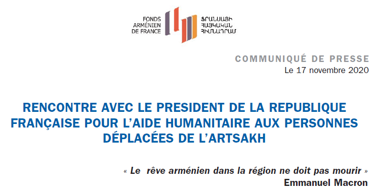 À l’invitation du président de la République Emmanuel Macron, une réunion s’est tenue le jeudi 12 novembre à l’Élysée avec la participation du Fonds Arménien de France, représenté par son président Bédros Terzian, de l’ UGAB, représentée par sa présidente Nadia Gortzounian et sa directrice générale Anouch Dzagoyan, ainsi que la Fondation Aznavour, représentée par Nicolas et Kristina Aznavour. Étaient également présents André Manoukian, Youri Djorkaeff et Me Stéphane Hasbanian. L’ambassadeur de France en Arménie, Jonathan Lacôte, a également participé aux discussions par vidéo conférence.