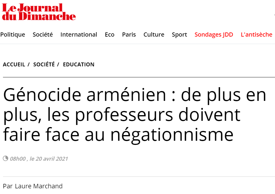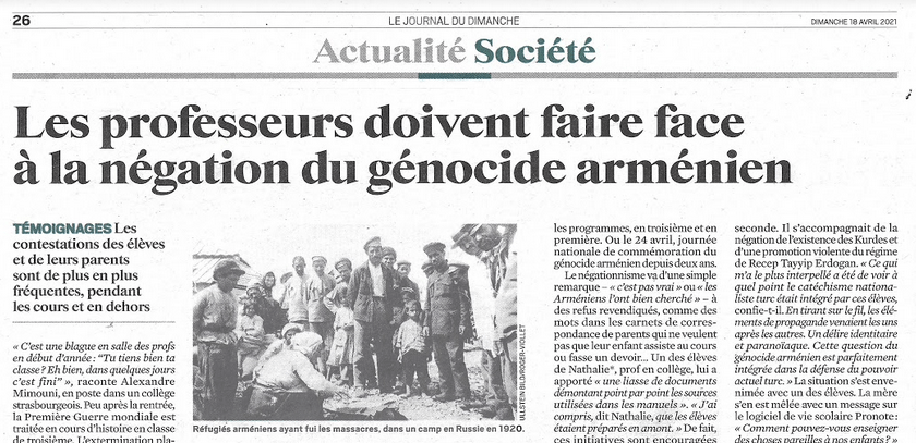 A Strasbourg les profs doivent faire face à la négation du génocide arménien de leurs élèves Le Journal du Dimanche du 18 avr 2021 Lire la suite (jpg) Le JDD web du 20 avr 2021 Voir l’article sur lejdd.fr Transférer vers : Cliquez pour partager sur Facebook(ouvre dans une nouvelle fenêtre) Facebook Cliquer pour envoyer un lien par e-mail à un ami(ouvre dans une nouvelle fenêtre) E-mail Cliquez pour partager sur WhatsApp(ouvre dans une nouvelle fenêtre) WhatsApp Cliquer pour partager sur X(ouvre dans une nouvelle fenêtre) X Cliquer pour partager sur Bluesky(ouvre dans une nouvelle fenêtre) Bluesky Cliquer pour imprimer(ouvre dans une nouvelle fenêtre) Imprimer J’aime chargement… Similaire