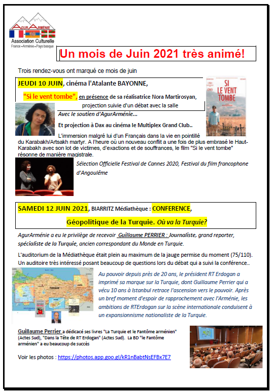 Vous trouverez ci-dessous les Petites Infos de votre association AgurArménie, avec un retour en images (et parfois des vidéos) sur un mois de juin très animé,