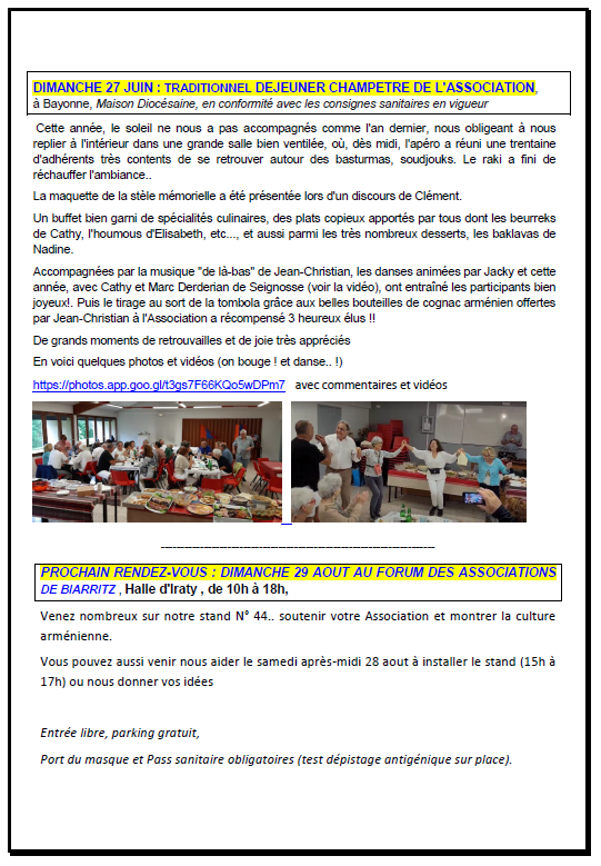 ainsi qu’une invitation à partager notre animation du stand 44 AgurArménie au Forum des Associations de Biarritz ce dimanche 29 août.