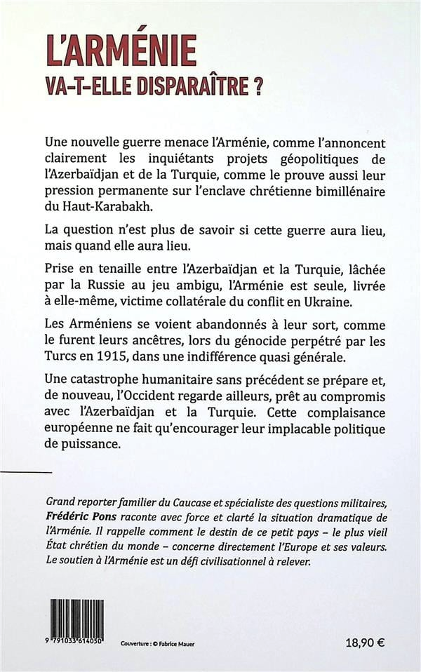 Grand reporter familier du Caucase et spécialiste des questions militaires, Frédéric Pons raconte avec force et clarté la situation dramatique de l’Arménie. Il rappelle comment le destin de ce petit pays – le plus vieil État chrétien du monde – concerne directement l’Europe et ses valeurs. Le soutien à l’Arménie est un défi civilisationnel à relever.