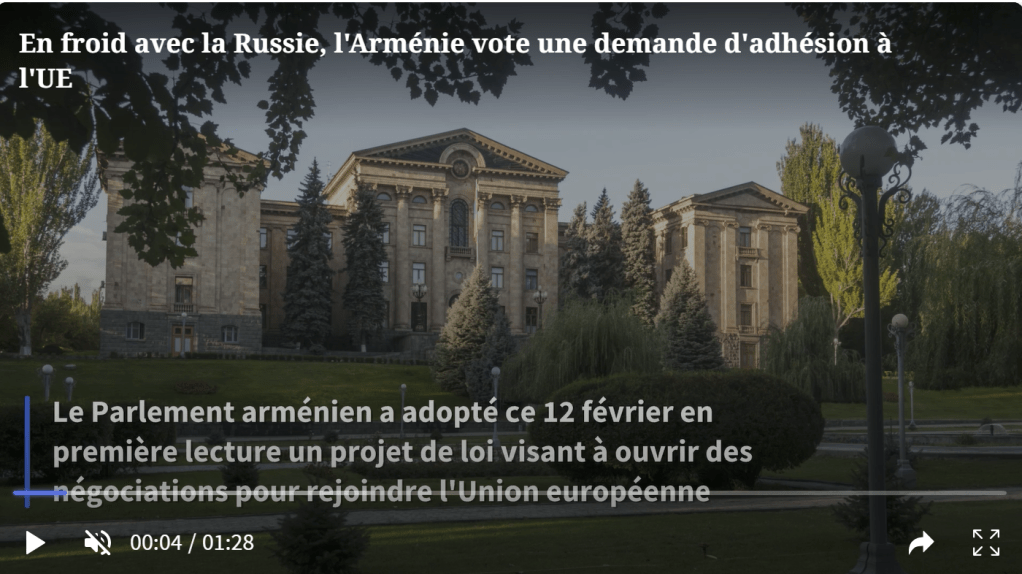 «Exprimant la volonté du peuple de la République d’Arménie, ayant fixé comme objectif de faire de l’Arménie un pays sûr et développé, l’Arménie annonce le début d’un processus d’adhésion à l’UE», indique le texte voté avec 63 voix «pour» et sept voix «contre». Le texte devra désormais être étudié en deuxième lecture. Il avait été soumis aux élus le 9 janvier dernier par le gouvernement de cette ex-république soviétique du Caucase.