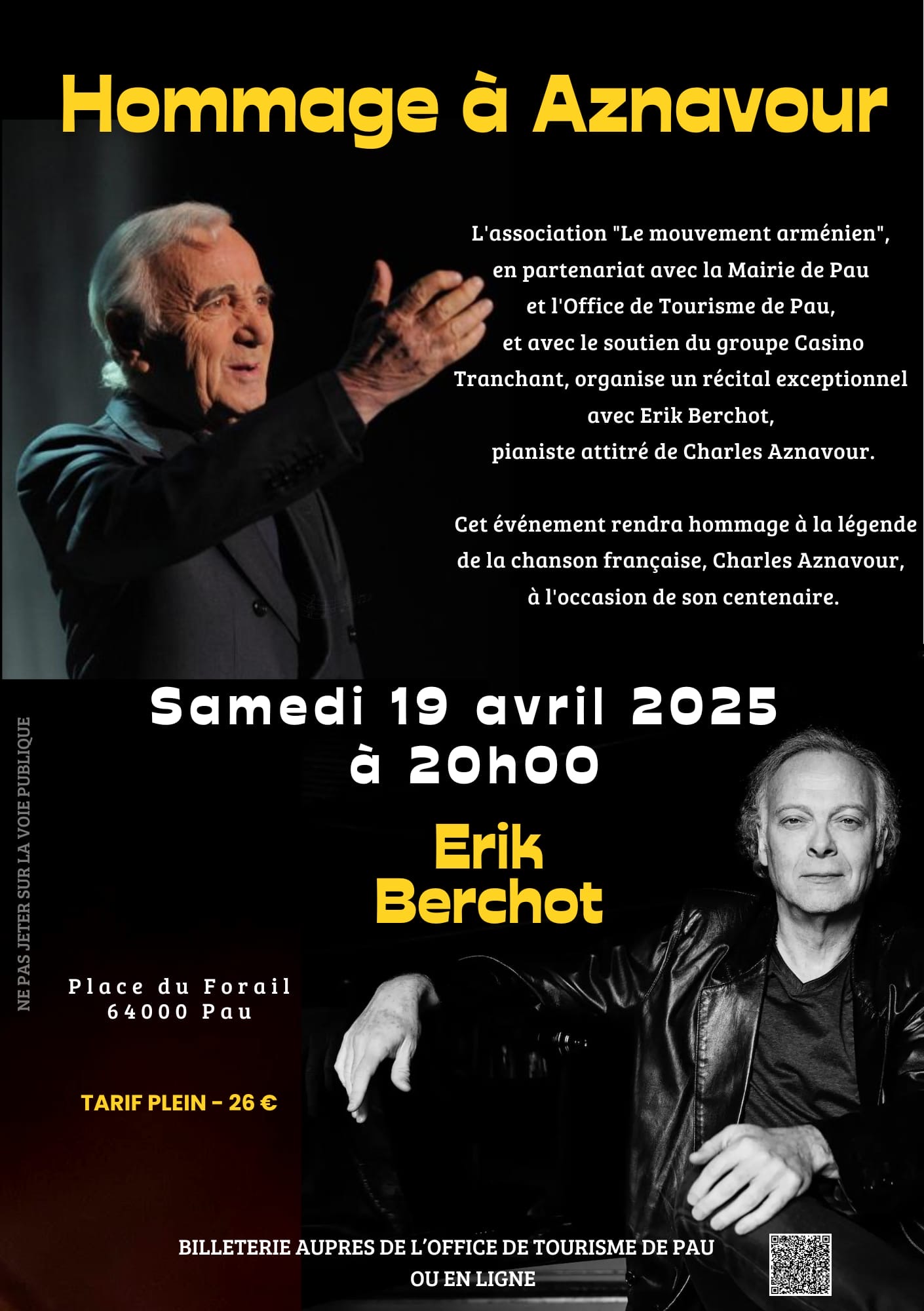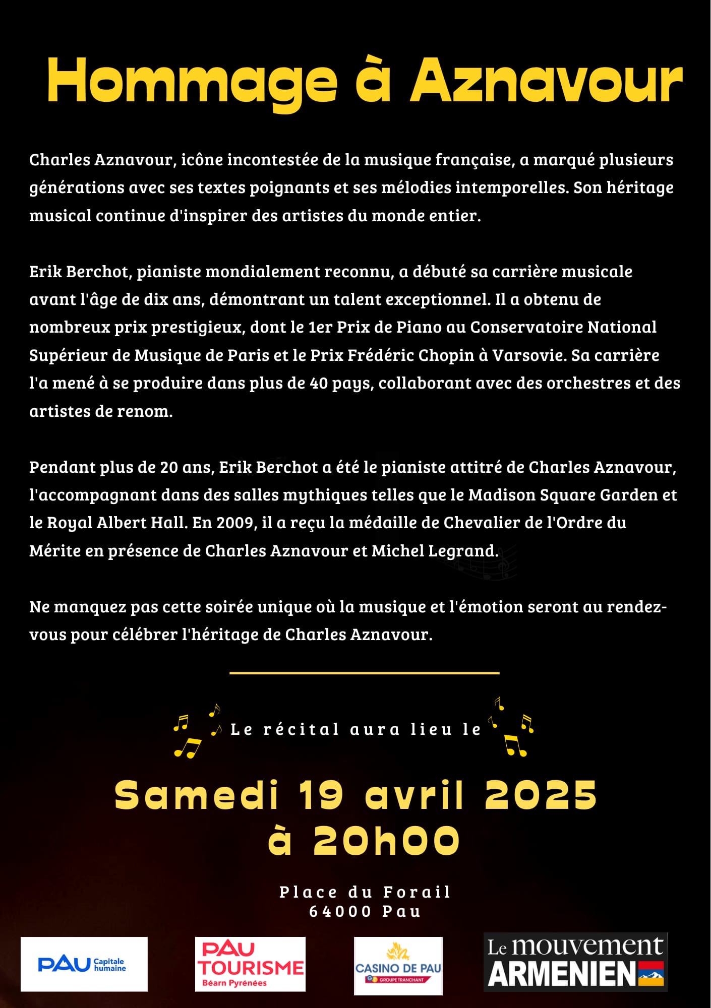 Ci-dessous l’affiche de l’événement « Hommage à Aznavour » un récital par le virtuose Erik Berchot, pianiste attitré d’Aznavour (mais aussi Michel Legrand).