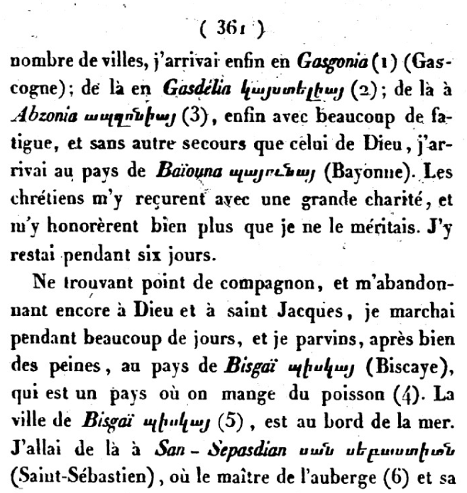 Ainsi à la page p.361 de l’article scanné entièrement sur Gallica, le site web de la BnF lien Gallica on peut lire : « … je continuai mon voyage avec beaucoup de peine, à pied ; parcourant ainsi un grand nombre de villes, j’arrivai en Gascogne. Enfin, avec beaucoup de fatigue, et sans autre secours que celui de Dieu, j’arrivai au pays de Bayonne. Les chrétiens m’y reçurent avec une grande charité et m’y honorèrent bien plus que je ne le méritais. J’y restai pendant six jours. »