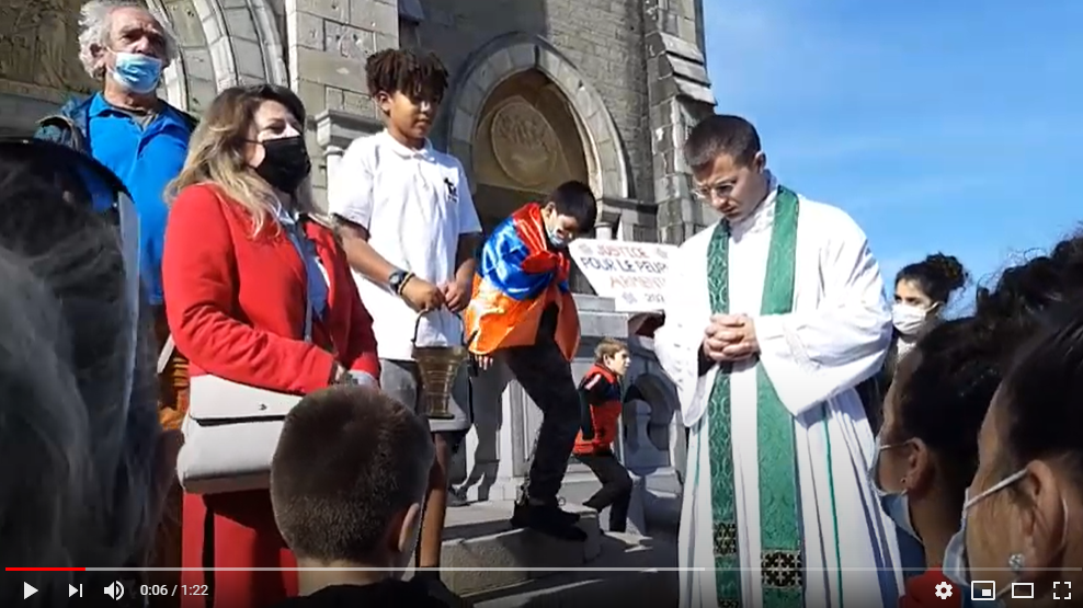 La cérémonie devait être limitée au parvis du Monument aux Morts, comme les responsables de l’association s’y étaient engagés vis à vis de la Mairie. Une échappée spontanée a défilé avec drapeaux et quelques slogans anti-Erdogan et anti-Aliev, dans les rues de Biarritz, souvent applaudie par les badauds de la braderie, jusqu’à l’église Ste Eugénie. Là, sur le parvis, un prêtre est sorti bénir les participants, une prière a été récitée en Arménien pour le Karabagh, un moment très émouvant pour tous.